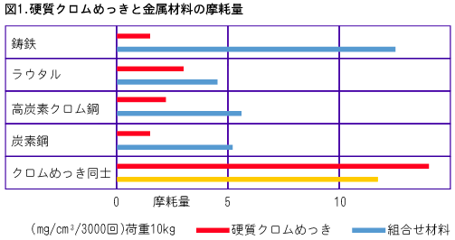 このように工業用クロムめっきが広く用いられる所以は硬さが大きく摩擦係数が小さいので耐磨耗性に優れていること、